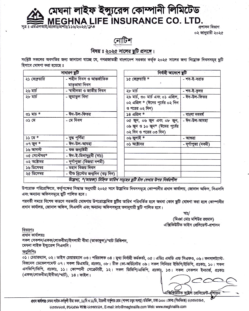ছুটির তালিকা - ২০২৫